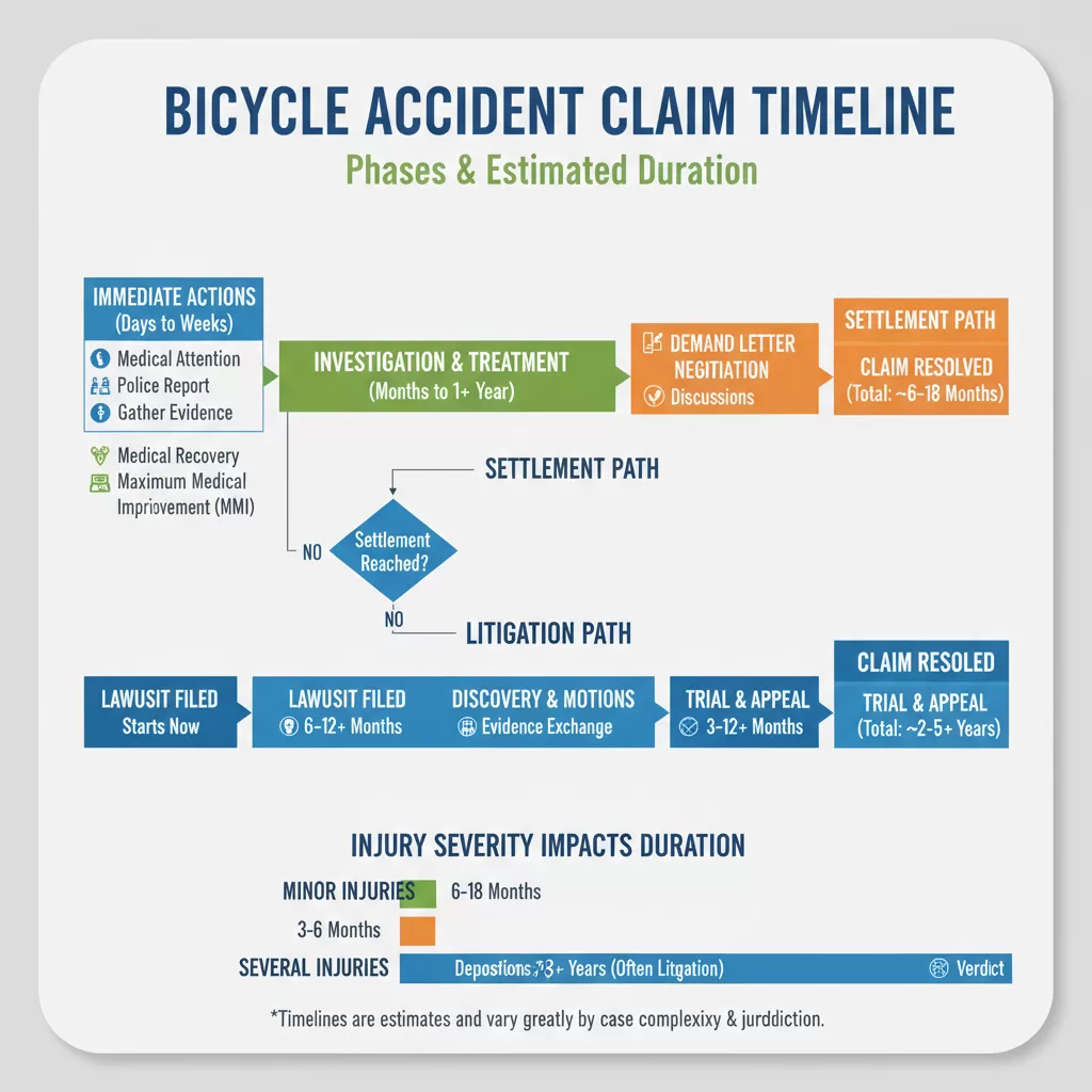 Bicycle accident claims typically take between 3 to 12 months for settlement, though severe cases involving litigation can last 12 to 24+ months. Most claims settle before trial, but cases requiring litigation can take up to three years. The trial itself can take several weeks to months to complete, depending on the complexity of the case. The timeline can vary greatly, depending on your case.