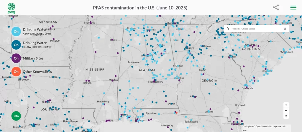 PFAS appear in multiple regions, including industrial corridors and areas with older landfills. Rural communities can also be affected if private wells draw on contaminated groundwater. Although testing is not uniform across the state, clusters of PFAS contamination have been documented in parts of northern and southwestern Alabama.