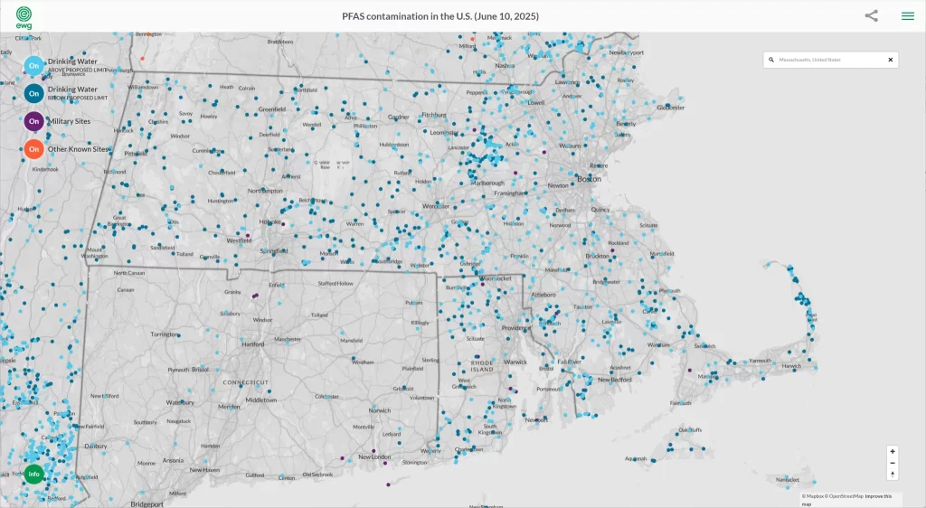 The MassDEP leads regulatory efforts, enforcing water quality standards and overseeing cleanup initiatives. Under the Massachusetts Pesticide Control Act (Chapter 132B) and other regulations (333 CMR), the state monitors PFAS-related pesticide usage, industrial processes, and agricultural applications. MassDEP also compiles public water system data to identify communities at risk. Their website provides testing recommendations, details on treatment technologies, and instructions for private well owners.