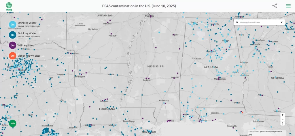 State authorities are paying special attention to water systems because Mississippi’s aquifers are a primary drinking water source. Military sites such as Columbus Air Force Base have reported PFAS in groundwater that exceeded federal advisory levels. Fire training installations and airports, including Gulfport-Biloxi International Airport, have also documented PFAS presence. Combined, these sources highlight that PFAS, though not produced in bulk locally, can still accumulate and affect resident health and the environment.
