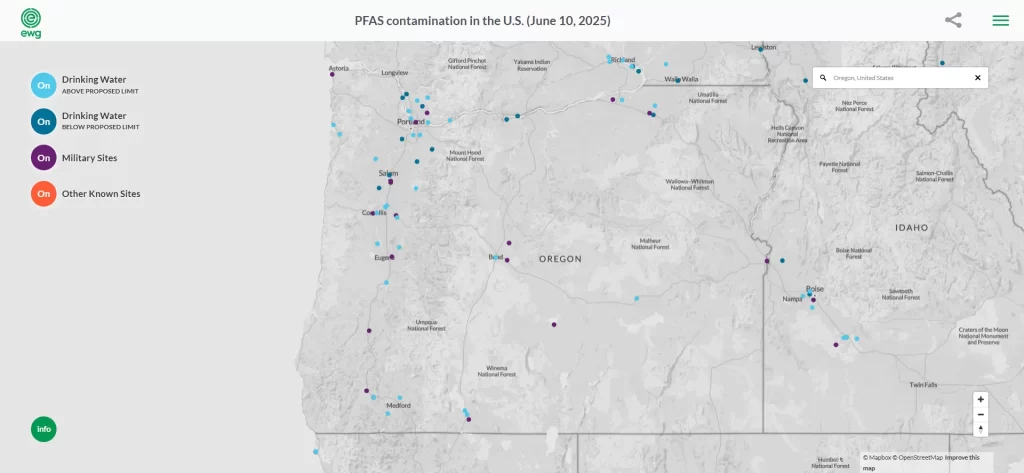 PFAS contaminants have been found in multiple parts of Oregon, including surface water, groundwater, soil, and even fish. According to DEQ, affected areas include sites near industrial complexes, military installations, and firefighting training areas where AFFF foam may have been used. While some regions show minimal or no detection, ongoing testing may reveal additional hotspots.